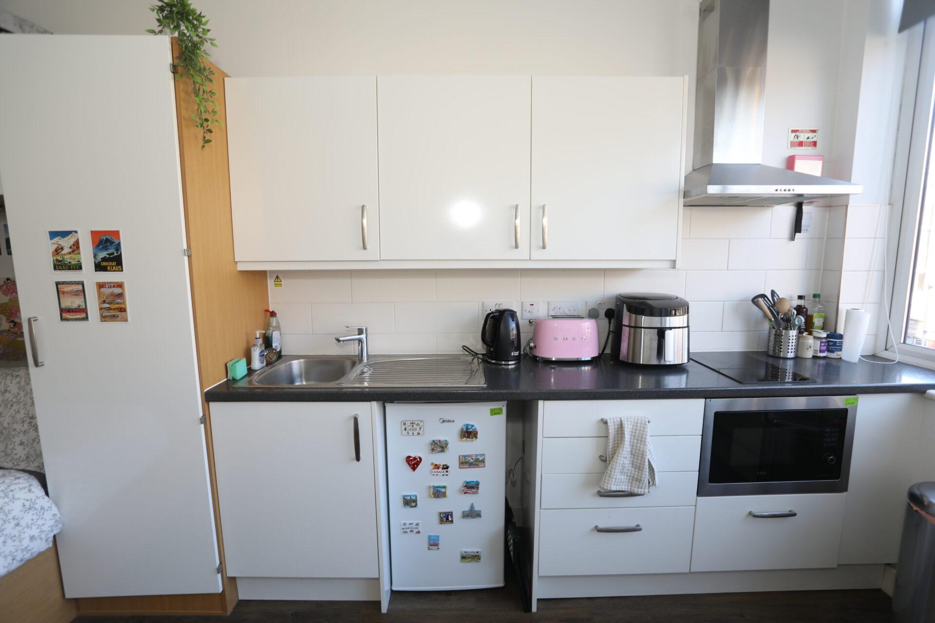 Studio with kitchen: Cooker/hob & fridge/freezer