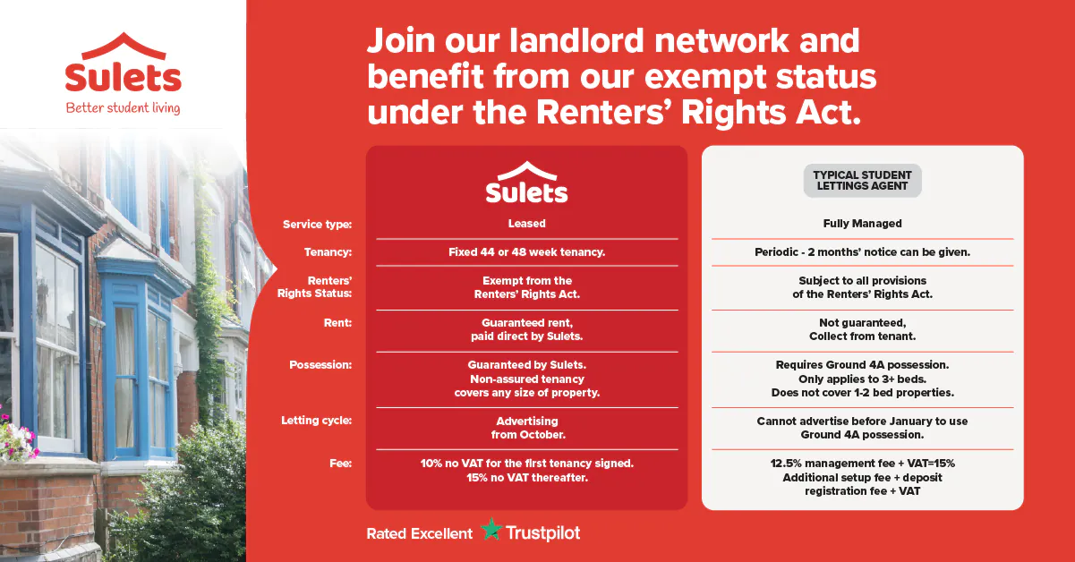 Sulets is a unique not-for-profit student lettings agency with exempt status under the Renters’ Rights Act, offering landlords a comprehensive Leased Service.